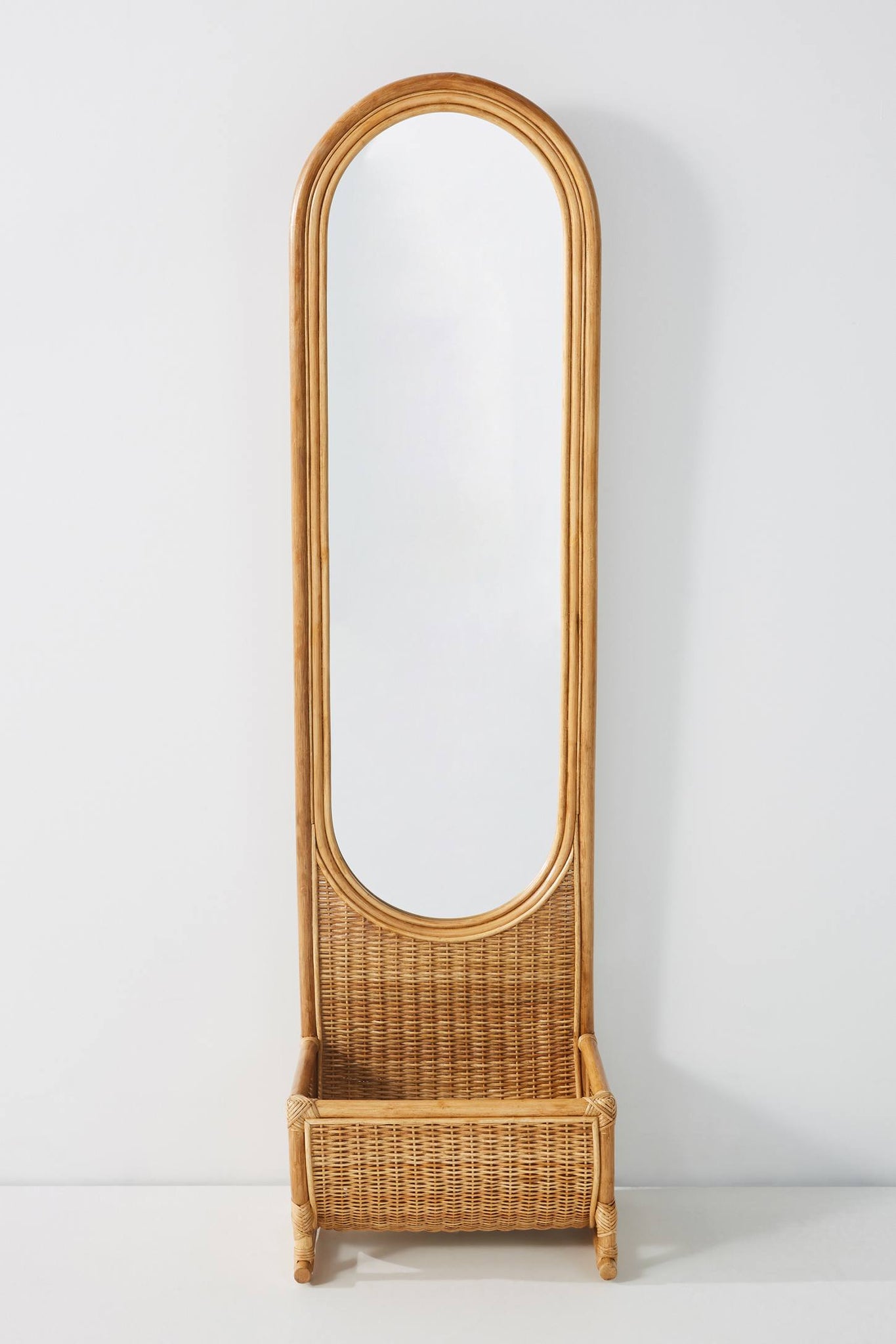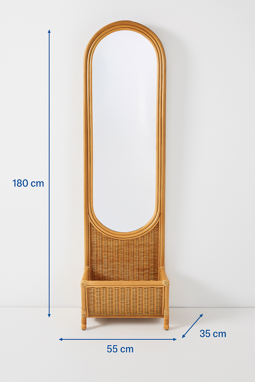 Elevate your entryway, bedroom or living space with this elegant hand-woven rattan full-length mirror featuring a built-in storage basket at the base. The natural cane/rattan frame brings a warm, earthy texture — perfect for boho, coastal, or Scandinavian-inspired interiors. The tall vertical mirror offers full-body reflection, and the woven basket adds both charm and functional storage for small items like scarves, slippers, keys, or decorative blankets. As each piece is handcrafted, expect unique variations in weave pattern, color tone, and texture — giving every mirror its own character.